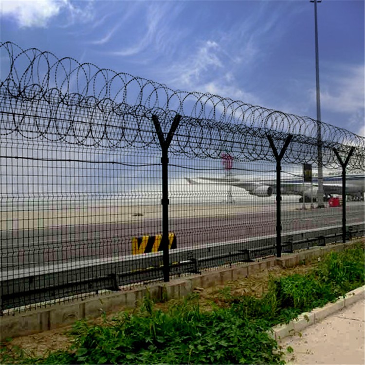 如果在飛機場圍界防護網頂部加裝刀片刺絲、刀片刺網后又很好的增強了安全防護性能。采用電鍍、熱鍍、噴塑、浸塑等防腐形式,具有很好的抗老化、抗曬、耐腐蝕等特點。其產品造型美觀、花色多樣,既起到圍欄作用,又起到美化作用。由于具有安全性高、防攀爬能力好,網片連接方式采用特制SBS緊扣件,有效防止人為的破壞性拆卸,橫向四道折彎加強筋,使網面強度顯著增加。