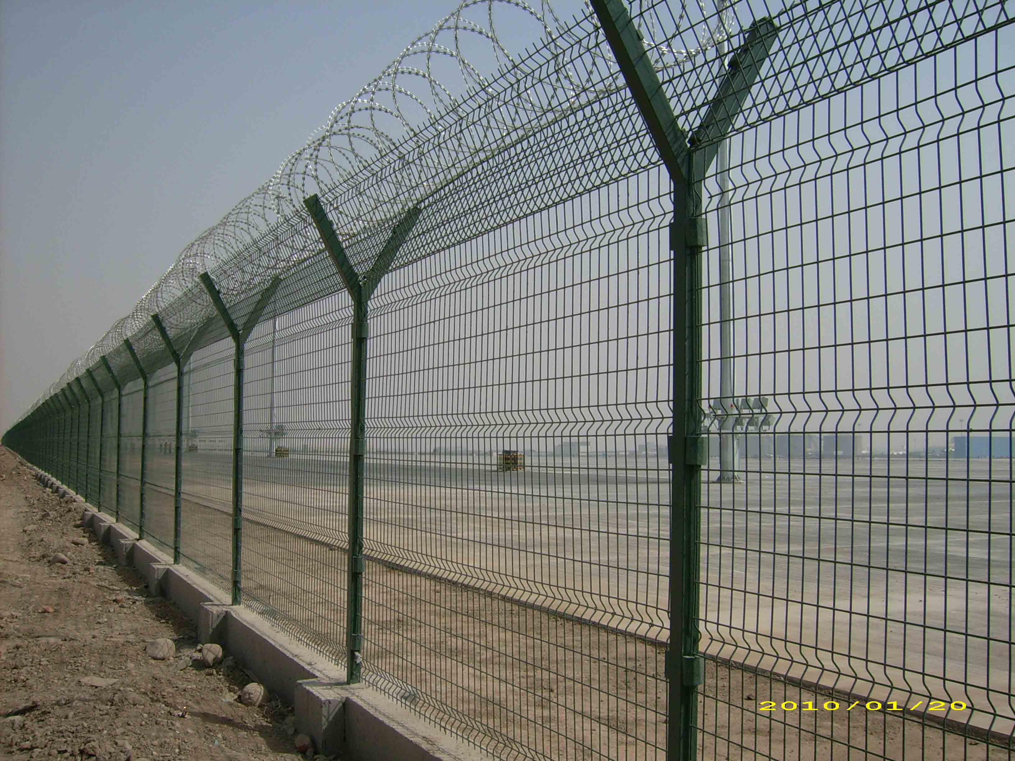 適用于機場封閉、私人地域、 軍事重地、場區圍網、開發區隔離網使用.機場護欄網制作工藝:預直絲、裁剪、預彎、焊接、檢驗、置框、破壞性實驗、美化(PE、PVC、熱浸)、包裝、入庫。使用,只需采用不不同的立柱固定方式便可實現。