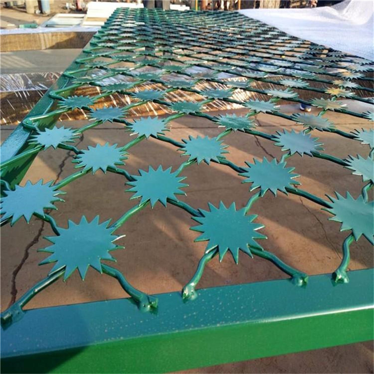 1、梅花刺片:梅花刺片直徑不小于7.5cm(直徑6cm、7cm、8cm),刺片厚1.5mm,采用Q235低碳鋼板沖壓成型。梅花刺片用氬弧焊將梅花形刺片焊接在美格網的節點上,形成刺形保護,有效的防止了手握腳攀。