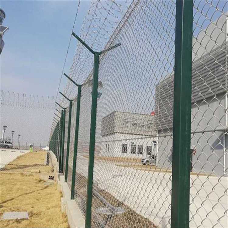 鋁包鋼絲機場圍界網是使用一種新型原材料鋁包鋼絲制作而成的機場圍界網產品,鋁包鋼絲是將鋼絲芯線外層包裹一層鋁作為外層防腐材料,它比傳統的PE或者PVC包塑鋼絲防腐性能更強,通常可以延長機場圍界產品使用壽命10-15年以上,適合于沿海空氣濕潤腐蝕性強的地區和環境較惡劣的沙漠邊緣地帶。鋁包鋼絲機場圍界網孔一般為50*50mm,絲徑5mm,頂部可搭配有V字叉和刀刺滾籠以加強防護能力。它還有一個優點就是鋁層是與鋼絲一起經機械拉拔到一起的,不易脫落。