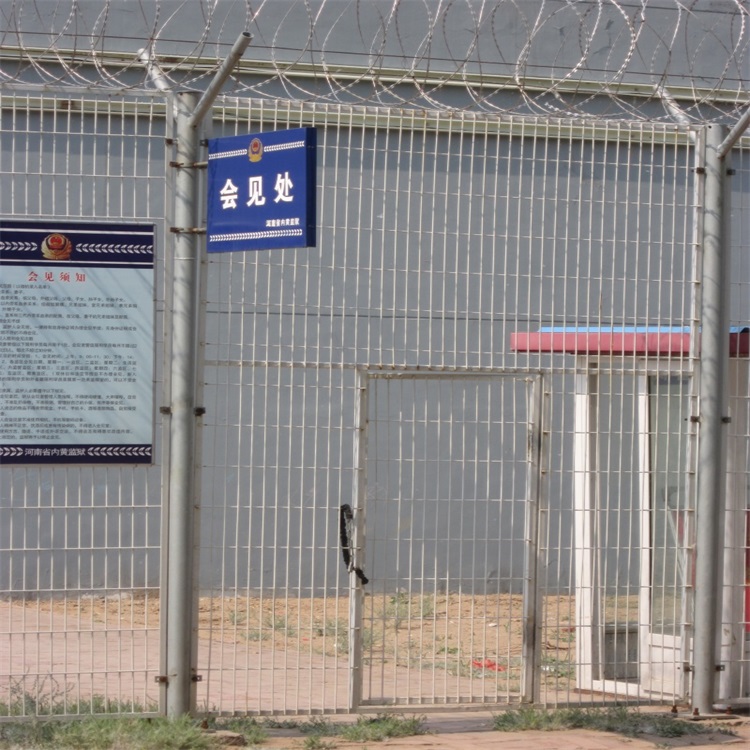 注:如果在監獄護欄網頂部加裝刀片刺絲刀片刺繩后又很好的增強了安全防護性能。采用電鍍、熱鍍、噴塑.浸塑等防腐形式,具有很好的抗老化、抗曬、耐候等特點。其產品造型美觀、花色多樣,既起到圍欄作用,又起到美化作用。由于具有安全性高、防攀爬能力好,網片連接方式采用特制SBS緊扣件,有效防止人為的破壞性拆卸,橫向四道折彎加強筋,使網面強度顯菩增加。