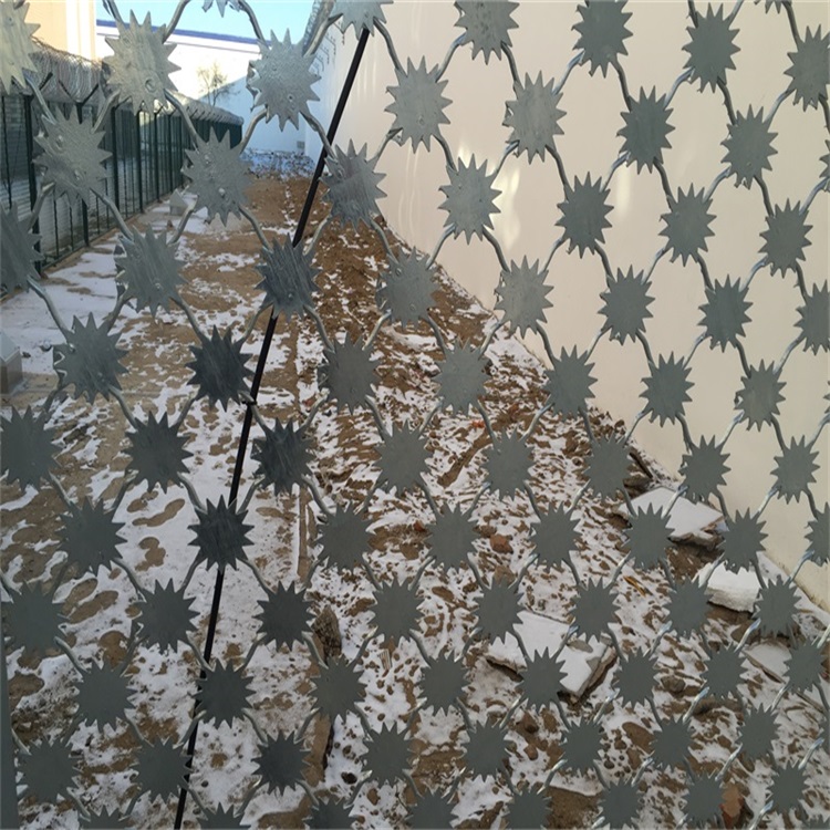 太陽花護欄網,主要是采用高強度的刀片剌網與普通防護網的結合,由V型支架立拄,加強型焊接片網,安全防盜連接件和刀片刺網組成。刀片剌網是一種新型防護網,由銳利尖角鍍鋅鋼板或不銹鋼薄板做刀片,鋼絲做芯線組合而成的防護器材。