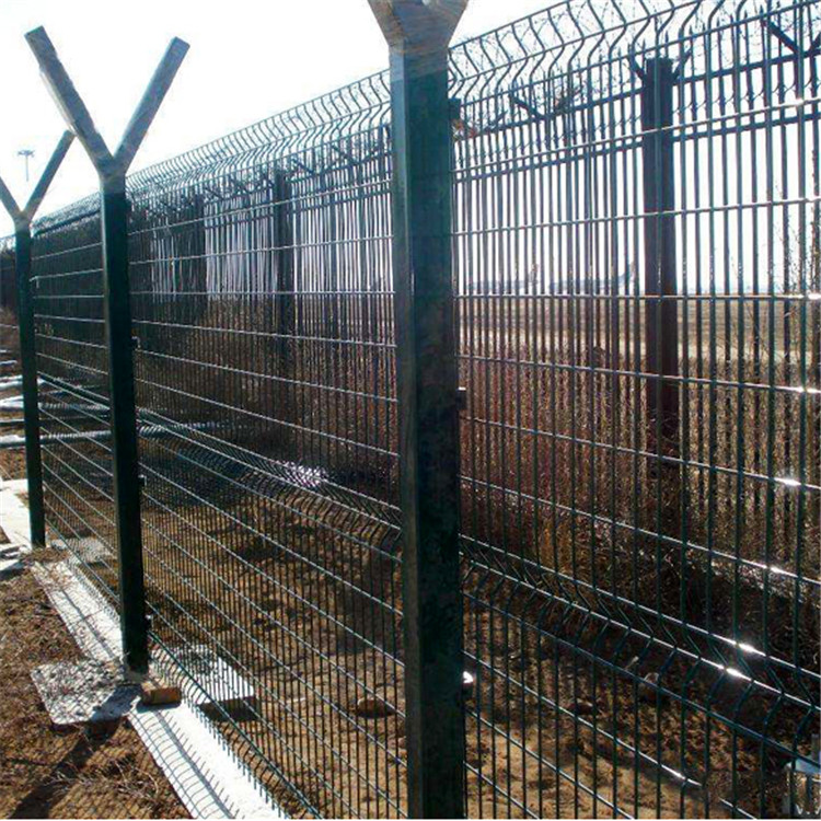 特點:如果在機場護欄網頂部加裝刀片刺絲、刀片刺繩后又很好的增強了安全防護性能。采用電鍍、熱鍍、噴塑、浸塑等防腐形式,具有很好的抗老化、抗曬、耐候等特點。其產品造型美觀、花色多樣,既起到圍欄作用,又起到美化作用。由于具有安全性高、防攀爬能力好,網片連接方式采用特制SBS緊扣件,有效防止人為的破壞性拆卸,橫向四道折彎加強筋,使網面強度顯著增加。