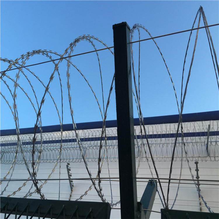 螺旋型刀片刺絲, 螺旋單一型刀片刺網是由一根蛇腹型刀片刺繩環繞而成,不需要使用卡子來固定,按照其展開的自然形式進行安裝。是刀片刺繩布置的一種,它沿墻壁或柵欄自然環繞來達到防護目的。單螺旋刀片刺繩一般使用的刀型是CBT-60和CBT65。材質:優質低碳鋼絲, 鍍鋅、涂塑、噴塑 。特點:網身剛硬,可以安裝傳感裝置等、不必用張力絲、不需要高技術工人維護、易安裝、維護成本低。