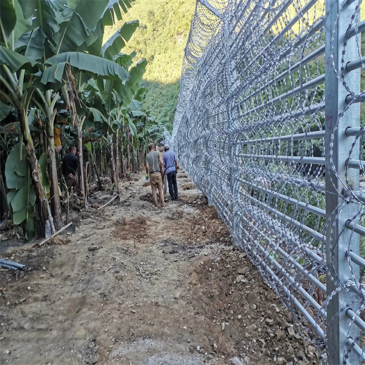 螺旋圈狀刀刺網主要利用其獨特的形狀和材料特性來阻止罪犯的入侵和逃脫。這種刀刺網通常由高強度材料制成,如不銹鋼、高強度聚合物等,具有極高的抗拉性能和刀片般的銳利邊緣。當罪犯接觸到刀刺網時,其銳利的邊緣會對其造成嚴重的切割傷害,使得罪犯不敢輕易攀爬或穿透