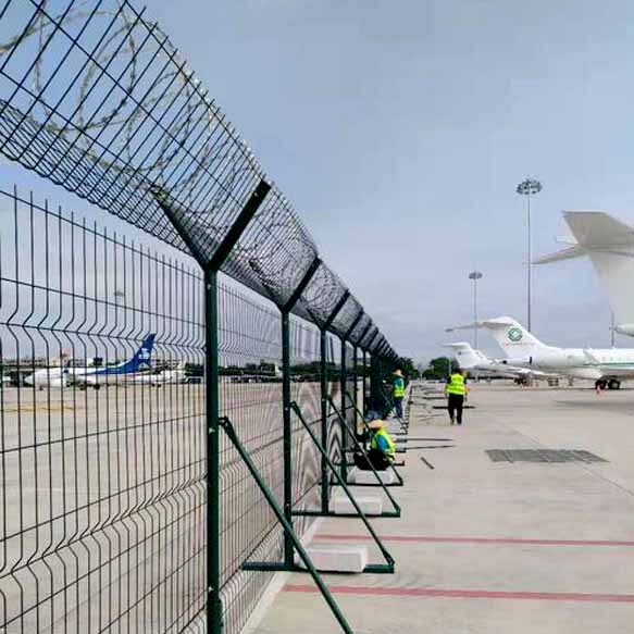 機場圍網主要用V型支架立拄,加強型焊接片網,安全防盜連接件和熱鍍鋅刀片刺籠組成強度和安全防御性級別很高.近年來,被廣泛應用在機