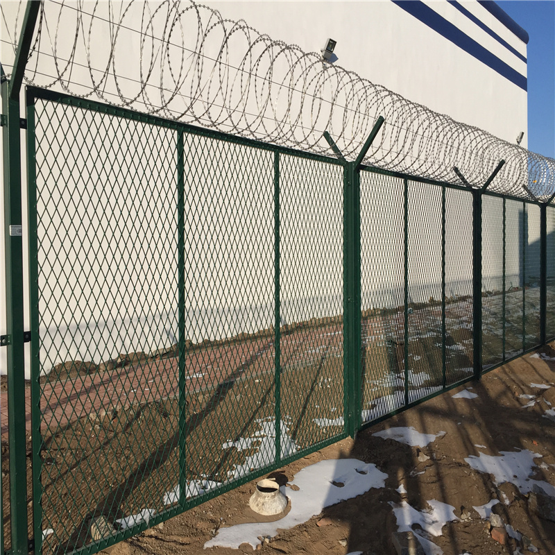 監獄安全網圍欄頂部按照要求安裝蛇腹形刀刺網,立柱頂部的V型直接兩個側臂焊接有專用的刺網勾,是每個側架設三道熱鍍鋅鋼絲,形成一個V型槽,然后把刀刺網放到上面,再用配套卡扣把鋼絲和刀刺網連接到一起,如果V型架內安裝V型網架,安裝就更簡單了,直接把刀刺網連接到V型網上面就可以了。